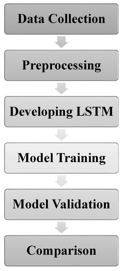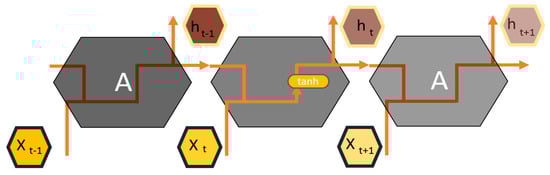 A deep-learning method designed for sequential data is the recurrent neural network (RNN) that has recently received additional attention from researchers primarily because of its capability in learning sequences [,,]. RNNs have been widely applied to many time-dependent datasets for use in prediction problems like speech prediction, pattern prediction, economic prediction, and traffic prediction [,,]. Since RNNs are developed to utilize historical data in time-series analysis, inclusion of a regression model that relies on explanatory variables and historical data of the response variable improved the model accuracy. These networks are designated as recurrent because future forecasting depends on both current and previous stages. Several RNN algorithms, such as the long short-term memory (LSTM) network, have been developed over the past two decades. LSTM was introduced to support modeling and forecasting of long-term data series. The network was developed to overcome the vanishing gradient problem in which algorithms tend to accumulate errors when a long string of observations are added as predictor variables, increasing prediction variability and associated total error. Based on the literature, another RNN network called the gated recurrent unit (GRU) also solved the vanishing gradient problem, but the LSTM outperformed the GRU in many details [].