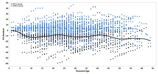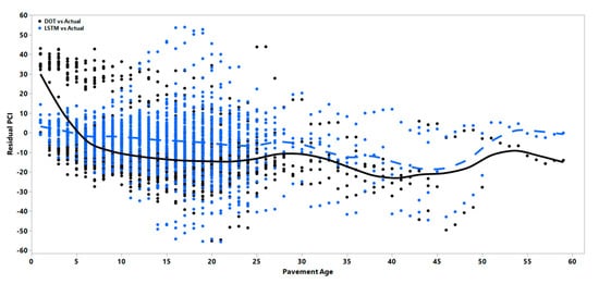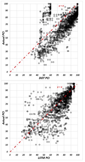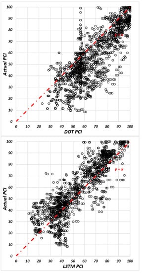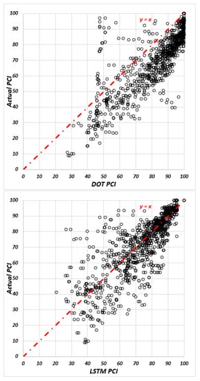 Additionally, the LSTM model outperformed DOT’s regression models with respect to PCC pavements. Fluctuations in the PCC database due to maintenance activities were less than the two other pavement types. The R-square values were 0.86 for the riding index, 0.62 for the faulting index, −0.26 for the cracking index, and 0.70 for the PCI in LSTM models, and the corresponding values in the DOT models were 0.66, −3.68, 0.26, and 0.44, respectively. Additionally, the result of SEEs for both models indicates that the LSTM model obtained less standard error of estimate, compared to DOT models. The SEE values in the LSTM models were 14.71 for the riding index, 26.83 for cracking index, 12.4 for faulting index, and 12.51 for the PCI while the values for the DOT models were 22.96, 20.37, 43.35, and 17.21, respectively.