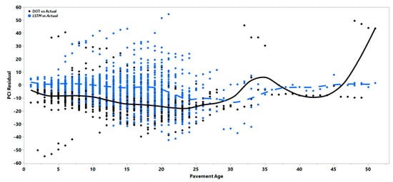 Figure 7, Figure 8 and Figure 9 also reflect the effect of age on the prediction residuals for each model in both the short- and long-term duration. These results show that the errors will more significantly widen and fluctuate after the first five years of pavement age for all three pavement types. Residuals can generally be either positive or negative; however, consistent differences between the predicted and observed values to one side of the prediction model is referred to as bias, and the variability in the mean observed value of these residuals is referred to as variance. Bias can be formally defined as the expected value of the model residuals, as shown in Equation (9):