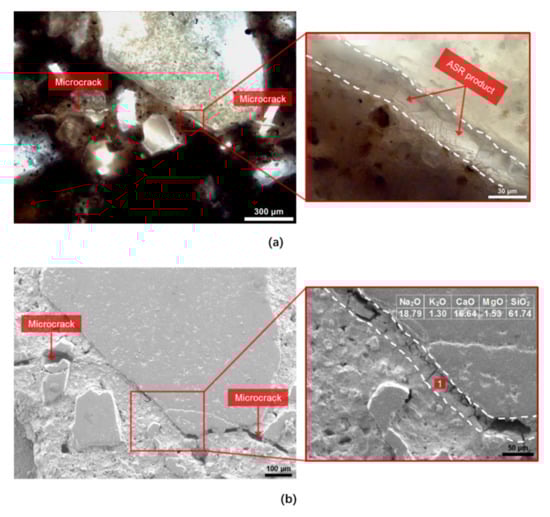 - Bleszynski, R.F.; Thomas, M.D. Microstructural Studies of Alkali-Silica Reaction in Fly Ash Concrete Immersed in Alkaline Solutions. Adv. Cem. Based Mater. 1998, 7, 66–78. [Google Scholar] [CrossRef]