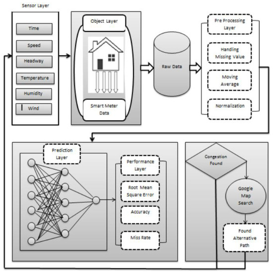 Figure 1 summarizes the process of the MSR2C-ABPNN system for sensory layers, which contains inputs to allow the prediction and identification of an area potentially subjected to congestion. If this is identified, a communication is broadcast to the vehicles, and an alternative route is then proposed. When a congested area is identified again, the procedure is repeated.