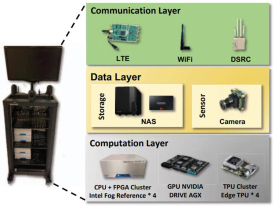 Figure 7). The first one allows vehicle communication through DSRC, LTE (Long-Term Evolution), or Wi-Fi, then the data layer accumulates vehicle-generated data cooperating with RSU. Finally, the last layer is equipped with GPU, edge TPU (Tensor Process Unit), an FPGA (Field Programmable Gate Array) accelerator, and the EQUINOX platform’s goal heterogeneous computing platform are to facilitate CAV processing. The communication layer has a crucial role because for the SRE environment where V2I is the main feature for CAVs, and it is fundamental to provide an efficient and continuous communication coverage when vehicles drive at high speeds like 120 km/h and then reduced. Therefore, the EQUINOX communication layer matches DSRC, Wi-Fi, and LTE communication to implement a complementary features device [
