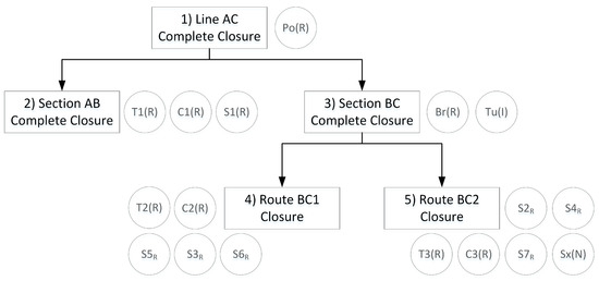 The assignment of the candidate interventions on the network states of the example network are shown in Figure 5 by circles. For example, network state 5 Route BC2 Closure is assigned to T3(R) as basic network state as this intervention only requires a closure of route BC2. The assigned network state of candidate intervention Po(R) is network state 1 as the renewal of the power feeding station requires shutting down the electricity on the entire line AC. For candidate intervention Br(R), it is assumed that the bridge renewal requires a complete closure of section BC. Thus, its assigned basic network state is state 3 Section BC Complete Closure. Interventions of intervention types IV and V, i.e., track vegetation maintenance and the track extension, are not assigned with a basic network state since they do not lead to any disturbance.