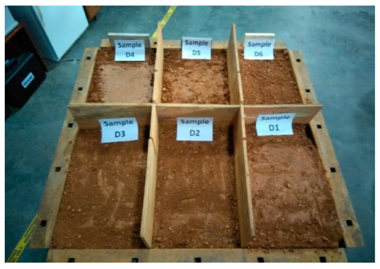 Test specimens were prepared in a large metal box measuring 1.8 m long × 1.8 m wide × 0.6 m deep (6 ft long × 6 ft wide × 2 ft deep), the box is divided to six sections as shown in Figure 3 and Figure 4. Each sample measures 0.9-m-long × 0.6 m wide. The soil was mixed with water till it reached the desired water content for soil compaction. The soil was then transported to the steel box and compacted using flat compactor as shown in Figure 3. Subgrade soil specimens were constructed with 0.3 m (12 in.) in depth and compacted to reach six (6) different density levels, as shown in Figure 4.