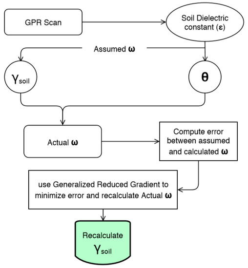 The soil bulk density is calculated using Equation (10) with an assumed gravimetric water content (w). Volumetric water content (θ) is calculated using Equation (11). It calculates the gravimetric water content (w), followed by the determination of error between the calculated and estimated gravimetric content. Generalized reduced gradient (GRG) was used to minimize the error and recalculate the correct values for estimated and calculated gravimetric water content, as shown in the flow chart in Figure 6.