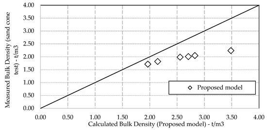 Figure 9 shows that in spite of the proposed model gives higher results than the actual density, there’s a consistent relation that could be developed. Therefore, an exponential model was utilized to adjust the error between the calculated and measured bulk densities, as shown in Equation (12).