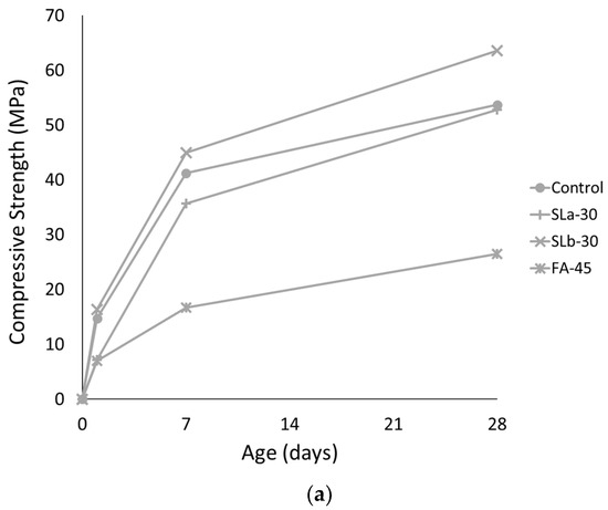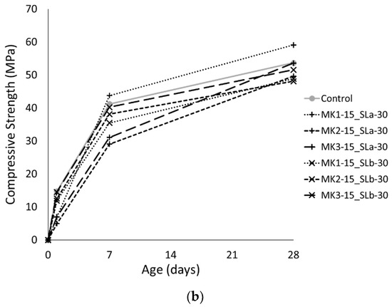 By contrast, ternary mixtures including SLb did not suffer lower 1-day strengths, ranging between 12 MPa and 14.5 MPa (1730 psi and 2110 psi), though they were still lower than control. Moreover, ternary mixtures including SLb exhibited the highest rate of strength gain from 1–7 days but saw less dramatic strength gain after 7 days of age. Overall (excluding MK1-15_SLa-30), the 28-day strength for ternary mixtures ranged from 48 MPa (6970 psi) to 54 MPa (7769 psi).