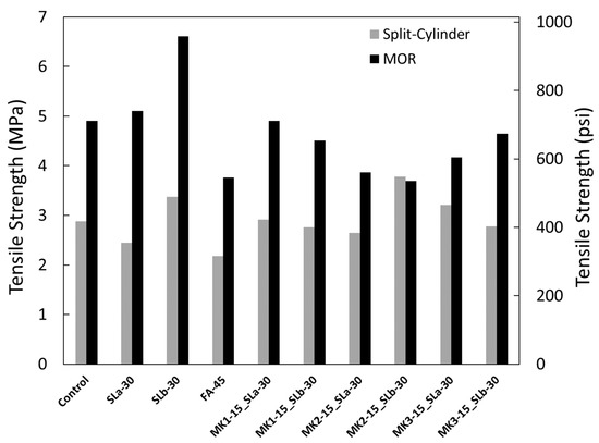 Binary slag mixtures were stronger in tension than control. Mixture SLa-30 produced a splitting-tensile strength that was 15% lower than control, while SLb-30 was 17% higher than control. MOR values for theses concrete mixtures were both higher than control, ranging between 5.1 and 6.6 MPa (740 and 958 psi), respectively. The fly ash mixture yielded a strength reduction in splitting-tension and MOR of 24% and 23%, respectively. Ternary SCM mixtures typically displayed lower tensile strength than control, however, MK1-15_SLa-30 performed similarly to control for both split-tension and MOR. Furthermore, with the exception of MK2-15_SLb-30 split tension results, ternary mixtures incorporating MK1 and MK3 appear to have higher tensile strengths than do ternary mixtures incorporating MK2. Finally, the choice of slag product does not appear to negatively affect the tensile strength of concrete in ternary mixtures.