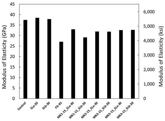 Concrete mixtures consisting of binary SCM mixtures (non-metakaolin) and ternary SCM mixtures have their modulus values given in Figure 4. Binary slag concrete mixtures displayed higher dynamic Young’s moduli (Ed) than the control, while all other mixtures saw a reduction from control. Increases were on the order of 1 GPa and 0.4 GPa (150 ksi and 60 ksi) for SLa-30 and SLb-30, respectively. The greatest reduction in the Young’s modulus was exhibited by the fly ash mixture, a decrease of 28% from control. There were no obvious trends among metakaolin or slag products for the ternary concrete mixtures, and reductions in Ed ranged from 12%-22% with an average reduction of 5.6 MPa (811 ksi).