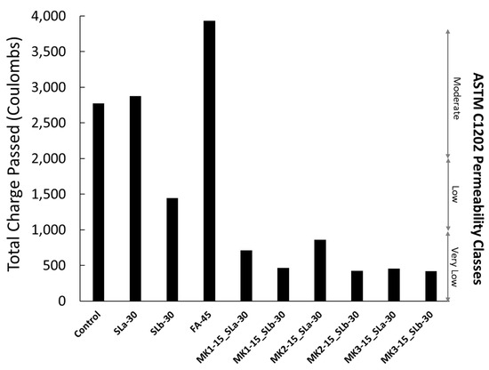 The most substantial benefits of the ternary mixtures were seen by the tests of durability, which were most likely the result of high CH consumption. All ternary mixtures indicated very low permeabilities. Five total mixtures passed less than 500 Coulombs (C), and two ternary mixtures were less than 400 C. The ternary mixtures including SLb recorded the lowest permeability, and the highest when combined with MK3 (study low of 419 C). In addition, a sulfate expansion of less than 0.60% was achieved by only one binary mortar mixture (MK1-20). By contrast, five of six ternary mortars finished over the 6-month testing period under this value. Similarly, all six ternary mortars met ASR expansion criteria. This indicates that, although durability performance varies widely within binary slag and binary MK mortars (see Figure 5, Figure 6 and Figure 7), ternary mixture durability is consistently high regardless of product combinations.