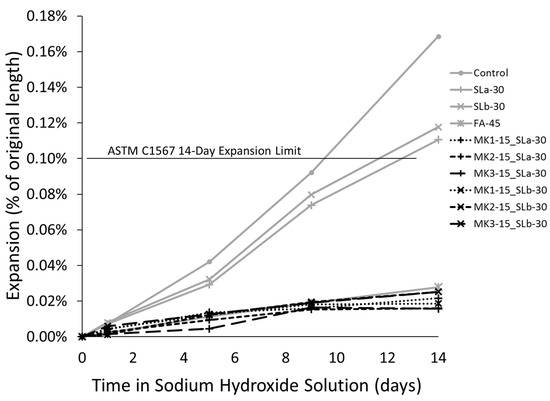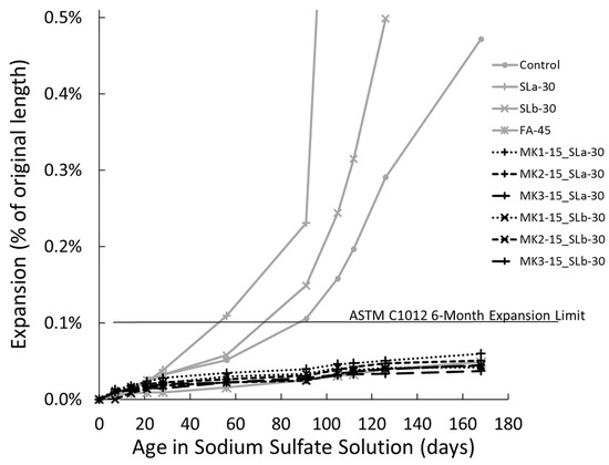 Sulfate test results are presented in Figure 6. Fly ash was the only SCM other than metakaolin that was able to sufficiently mitigate mortar expansion for the entire 6-month testing period. In fact, expansion experienced by the binary slag mortars was more accelerated than the control mixture. This was especially true for the mortar incorporating SLa. This is attributed to SLa having both higher Al2O3 content and the lower fineness. Although the expansion seen by the binary slag mixtures are excessive, it has been recommended that a slag be used at 50% or higher replacement level to mitigate sulfate attack [34]. In fact, for high Al2O3 contents (14% or greater), replacement levels of above 60% are recommended for this use [35,36]. All ternary mixtures were able to mitigate the sulfate expansion, and typically resulted in less than 0.06% expansion over 6 months.