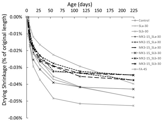 Figure 8 indicates that the ultimate drying shrinkage of ternary concrete mixtures containing MK and SL products were predominantly lower than the control, with an exception of MK1-15_SLa-30. The 224-day drying shrinkage of the control mixture was 0.048%. One mixture, FA-45 was slightly larger at 0.052%. The overall drying shrinkage of ternary mixtures decreased with the binary mixture, SLb, showing the lowest shrinkage until 112 days. For ternary mixtures including MK1, these values decreased to 0.034% and 0.042% for MK1-15_SLa-30 and MK1-15_SLb-30 mixtures, respectively. For ternary mixtures including MK2, shrinkage values decreased to 0.037% and 0.034% for MK2-15_SLa-30 and MK2-15_SLb-30, respectively. Similarly, ternary mixtures containing MK3, concrete mixtures decreased to 0.037% (in MK3-15_SLa-30) or 0.034% (in MK3-15_SLb-30), which is about 30% lower than the control.