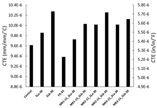 CTE results are presented in Figure 9. The binary fly ash concrete exhibited a 2% lower CTE than control. SLa-30 and SLb-30 varied widely from one another at 3% and 7% higher than the control, respectively. The latter was the highest CTE seen outside of the binary metakaolin concrete mixtures. MK1-15_SLa-30 saw the lowest CTE in the ternary group with a CTE of 9.73 × 10−6 mm/mm/°C (5.40 × 10−6 in/in/°F, an increase of 1% from control). MK2-15_SLb-30 saw the highest CTE in the ternary group with a CTE of 10.25 × 10−6 mm/mm/°C (5.70 × 10−6 in/in/°F, an increase of 7%). As a group the ternary SCM mixtures averaged a CTE of 9.93 × 10−6 mm/mm/°C (5.53 × 10−6 in/in/°F, an increase of 3%).