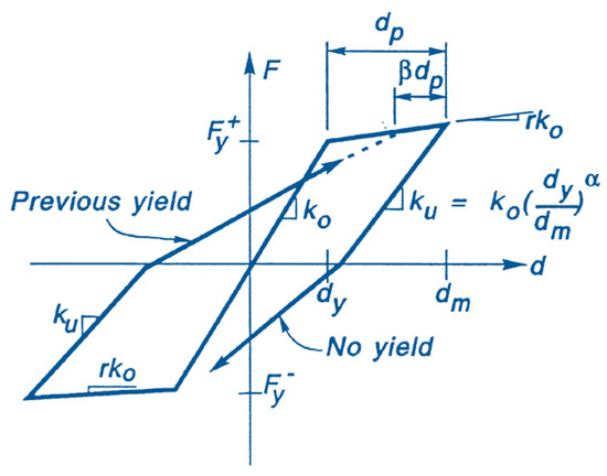 where the upper dots denote the derivative of time, M is the mass matrix of, C is the damping matrix according to the Rayleigh approach [24], KT is the tangent stiffness matrix and denotes the ground acceleration. The solution of the dynamic equilibrium equation has been provided by the Ruaumoko program [20]. Beam and column elements were both modeled as nonlinear frame elements with lumped plasticity by defining plastic hinges at both ends. For the beams, axial forces were assumed to be practically zero, since all floor slabs are considered to be rigid in their plan to simulate the diaphragm action. Typical input data for strength that are essential for Ruaumoko [20] are the axial force -bending moment interaction relations for vertical members (columns) and maximum and minimum strength values associated with bending moments for horizontal members (beams). In this research study, a home-made design and analysis program was developed for each reinforced concrete section using the model of fibers. The cyclic behavior of all members was evaluated using the well-known Takeda hysteresis model which is available in Ruaumoko [20] and it is shown in Figure 1. The phenomenological parameters of Takeda’s model are mainly influenced by the end resistances of columns and beams, which are evidently dissimilar for the corresponding structures of Group B. It should be mentioned that due to inadequate seismic design provisions for Group B, all these structures appear to have stiffness and strength degradation after yielding. One can consult the Ruaumoko user manual by Carr [20] for an in-depth description of degradation factors and their effect on the shape of the hysteresis model.