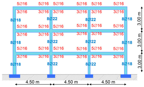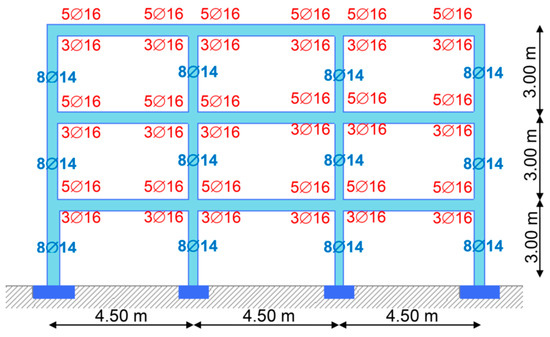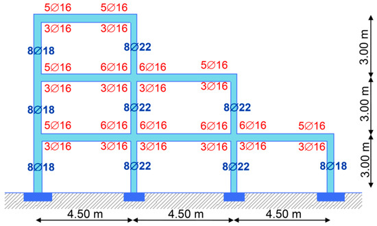Frames A3 and B3 (Figure 6 and Figure 7): the selected longitudinal reinforcement of the exterior columns of Frame A3 is 8∅18, and is 8∅22 for the interior columns. For all the beams of Frame A3 the reinforcement amount is 5∅16/3∅16. For the columns of first and second floor of Frame B3 the selected reinforcement is 8∅16, while for the others is 8∅14. For the beams of first, second, third and fourth floor of Frame B3, the selected reinforcement is 4∅16/3∅14, while for the others the reinforcement is 5∅16/3∅16.