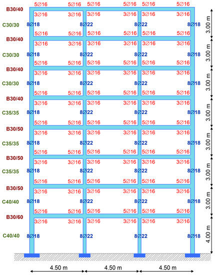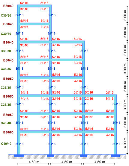 All frames under consideration have three equal bays with total lengths equal to 13.5 m (=3 × 4.5 m). Characteristic floor-to-floor height is equal to 3.0 m except for 8-story structures where the first floor height is equal to 4.0 m. Typical interior frames of these buildings are examined here in order to simplify the examined problem, i.e., to investigate two-dimensional models of these structures. The dimensions of beams and columns used in this study are typical frame element proportions in real existing structures. All columns are square with sides of 30–40 cm. All beams had a width equal to 30 cm and a height equal to 40–60 cm. It was expected that the amount of reinforcement for beams and columns of Frames A1–A4 would be higher than that of Frames B1–B4. This dissimilarity mainly has to do with the idea of capacity design of modern seismic codes, where columns are stronger than beams. Thus, the design of vertical members of Group A fulfills the provision of §4.4.2.3 of EC8 [21], for any joint of beams with columns