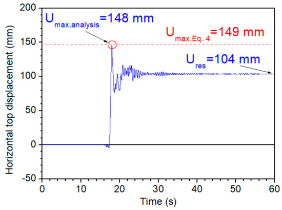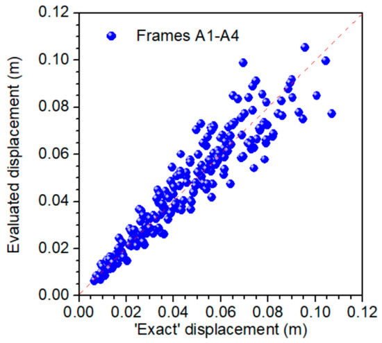 Figure 13 depicts the response of the structure, i.e., the time-history of the horizontal top displacement. For comparison reasons, the application of Equation (4) for Frame A4 (height H = 25 m, fundamental period T = 0.97 s) is also shown. It is evident that the proposed method can reliably evaluate the maximum top displacement, i.e., umax,Eq.4 = 149 mm since this value is very close to that from dynamic inelastic analysis, i.e., umax,analysis = 148 mm. Thus, the relative error is r.e. = 100%|148 − 149|/148 = 0.68%.