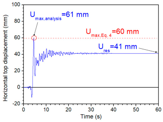 Figure 15 shows the response of the structure, i.e., the time-history of the horizontal top displacement. For comparison reasons, the application of Equation (4) for Frame B1 (height H = 9m, fundamental period T = 0.49 s) is also shown. It is evident that the proposed method can reliably evaluate the maximum top displacement, i.e., umax,Eq.4 = 61 mm since this value is very close to that from dynamic inelastic analysis, i.e., umax,analysis = 60 mm. Thus, the relative error in this case is r.e. = 100%|61 − 60|/61 = 1.64%.