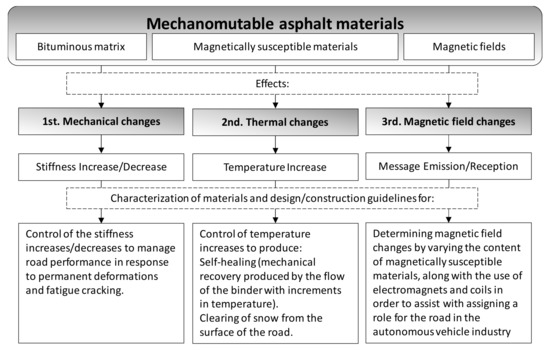 Mechanomutable asphalt materials can be defined as a bituminous matrix modified with ferromagnetic materials, which can modify mechanical performance using the effect of magnetic fields produced in permanent magnets [3,4,5,6,7]. As shown in Figure 1, this concept can be extended to thermomutable materials due to the thermal changes produced by the effect of magnetic fields generated in induction coils, which can also allow for the construction of encoded roads for smart cities (communication with self-driving vehicles, cars, scooters, bikes people with limited mobility, traffic signals and for collecting traffic count data, among other uses) [2].