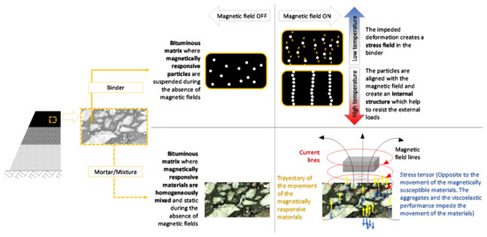 Mechanomutable asphalt materials were born from the principle of the functioning of the magneto-rheological (MR) fluids applied to asphalt binders [4,5]. As shown in Figure 2, the characteristics of magneto-rheological fluids provide a medium (in this case a bituminous matrix) in which to magnetically suspend active particles during the absence of magnetic fields. However, when magnetic fields are present, these materials have the capacity to behave as a quasi-solid material, increasing the apparent viscosity of the material [35,36], modifying its rheological behavior from Newtonian to viscoelastic [37] and impeding the movement of the magnetically active particles, which produce an internal stress tensor in the mixture [5].