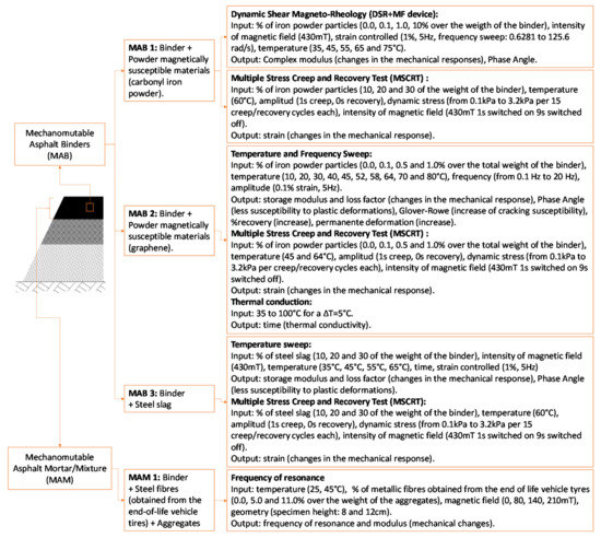 Included among this new generation of materials are mechanomutable asphalt materials (MAMs), which are composed of a bituminous matrix with magnetically susceptible materials activated by the effect of external magnetic fields, if needed. MAMs can be used in three main potential applications [1,2]: (1) the mechanical control of the modulus of the bituminous matrix, to improve the performance of specific areas of the road; (2) the generation of thermal changes in order to propose alternative solutions for road maintenance and (3) the construction of encoded roads to assist self-guided vehicle systems.