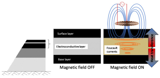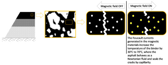 To achieve the first type of maintenance activity, the temperature of the electroconductive layer is increased with the goal to heat up the whole pavement system though conduction. This has the effect of melting possible snow and ice on the road and increasing user safety. For the second maintenance activity, a magnetic field is applied to the MAM to produce a controlled increase in temperatures between 30 °C and 70 °C, via induction [19,41] and microwaves [19], which is the interval of temperatures between which the binder flows as a Newtonian fluid and is then able to seal potential cracks in the pavement [22].