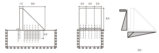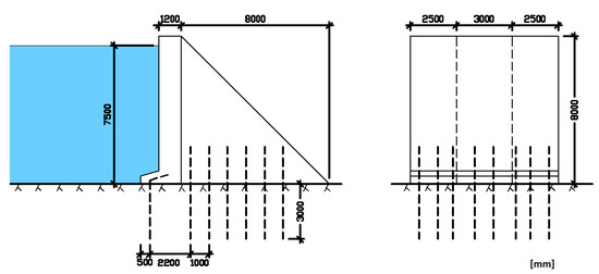To study how rock bolts affect the failure process of a small concrete dam, the research in this paper was performed as a case study, where one monolith from an 8 m high buttress dam in northern Sweden was used as the studied object. The dam is a small buttress monolith anchored with a total of 20 rock bolts. The front plate has a width of 8 m and a constant thickness of 1.2 m, with a 1 m wide dam toe and the buttress wall has a constant thickness of 3.0 m. Each rock bolt is drilled 3 m into the rock and embedded 2 m in the concrete. The bolts are ribbed steel rebars with a diameter of 25 mm. Eight of the bolts are located under the front plate in the upstream dam toe, and the remaining twelve are placed in two rows beneath the buttress wall. The dimensions of the monolith and the position of the bolts are shown in Figure 1. The bridge on the dam crest was not included in the analysis to simplify the geometry.
