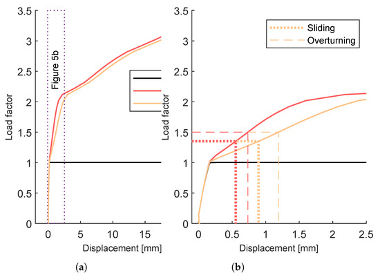 Load factor as a function of crest displacement, a load factor up to 1.0 includes all design loads while only the destabilizing loads are amplified for greater load factors. Case 1 is without bolts; Case 2—bolts with a fixed attachment and Case 3—bolts with deformable attachment. (a) The complete load-displacement curve, and (b) load-displacement curve for the initial part of the curve with the the required safety factor for sliding (1.35) and overturning (1.5) according to the Swedish guidelines for dam safety marked [2].
