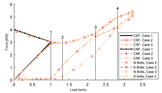 Shear and normal reaction forces as a function of load factor presented as forces in the bolts and on the surface of the dam-rock interface. The notation CNF is the contact normal force, and CSF is the contact shear force. N and S are normal and shear forces in the bolts, respectively. Case 1 is without bolts; Case 2 bolts with a fixed attachment and Case 3 bolts with deformable attachment.