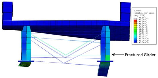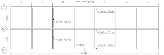 In steel girder bridges, fatigue cracking is one of the most important phenomena affecting the structural performance and integrity []. In general, fatigue cracks are the result of out-of-plane distortion or other unanticipated secondary stresses at low fatigue resistance members. Development of fatigue cracking may lead in time to a full depth fracture of one girder and cracks in the deck [] without noticeable bridge profile changes. It is critical to assure that the bridge will have adequate capacity to prevent collapse until the next cycle of inspection discovers the damage. The fracture can also be detected through instrumentation at the onset of fracture or by periodic vibration measurements at inspection intervals or earlier [] and different strategies can be used to repair and retrofit the damaged bridge [,]. It is realized that once one of the bridge girders is fractured, vertical dead and live loads need to be distributed through an alternative path to the intact girder(s) which could occur through the deck or girder cross-frames. In this case, cross-frames can play an important role in transferring the loads and preventing sudden collapse of the fractured girder. However, currently cross-frames are required to be designed only for preventing lateral torsional buckling of the bridge girders during construction, transferring lateral loads such as wind and earthquake to the deck and from the deck to the supports for controlling torsional stresses, as well as large rotation due to loads applied to the overhangs. As a result, when fracture occurs in one girder, they may not have enough stiffness and strength and may be too far spaced to be able to transfer vertical loads to the intact girder(s).