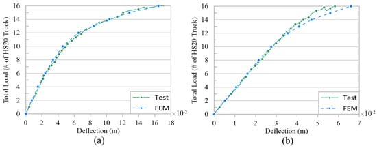 A two-stage loading and simulation scheme was used for FE modeling of the bridge through the construction process. This included the stage where the fresh concrete is placed in the deck and the stage after hardening of the deck concrete. The first stage corresponds to steel girders carrying the entire dead load and the second stage corresponds to additional load carried out by the composite action of the girders and the deck. These conditions were modeled by varying the stiffness and mass of the concrete before and after hardening of the concrete. The first stage was used as initial stage for starting the second stage. Details of this modeling process can be found in the work by Abedin and Mehrabi []. The FE model was analyzed for the construction stage and subsequent point loading as reported for the laboratory tests on the University of Nebraska-Lincoln Bridge experiments. Experimental and FE analysis results for load-deflection are compared in Figure 4. The results are shown for deflection of both interior and exterior girders. The live loading in the FE model followed exactly the configuration reported for the experimental test mimicking (with a slight deviation on spacing from) the HS20 Truck loading at wheel footprints. The truck loading was applied in the FE model using a uniform pressure on the wheel footprints at the deck. Deflection noted on Figure 4 refers to the vertical displacement of the bottom flange of the girders at the mid-span. The total load referenced in Figure 4 is calculated as the sum of the point loads applied on the deck. The results show a good agreement between the load-deflection curves from laboratory tests and FE analysis, indicating the ability of the FE model for simulating the elastic and plastic global behavior of the bridge. Load-deflection curve obtained from FE analysis for the exterior girder (Figure 4b) shows slight departure from the experimental results in the plastic region. This can be attributed partly to the modeling accuracy for contribution of the railing in the deflection of the exterior girder. Overall, the load-deflection curves from FE analysis agree well with the experimental results. The FE model was also able to predict the local failures such as cracking in the railing and punching shear in the deck. It should be noted that since the concrete cylinder test results for the experimental test varied from 39 MPa (5.66 ksi) to 45.3 MPa (6.57 ksi) in 221 days after casting (the time of ultimate load testing), for the FE analysis in this study, the average value of 41 MPa (6 ksi) was considered for the concrete compressive strength of the deck and railings. Because of the effect of railing, variation of the concrete properties in the analysis from the actual properties can have larger effect on deflection of the exterior girder than that of the interior girder.