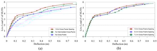 Load-deflection curve of the fractured girder at mid-span. (a) Different cross-frame layouts, (b) Different cross-frame spacing.
