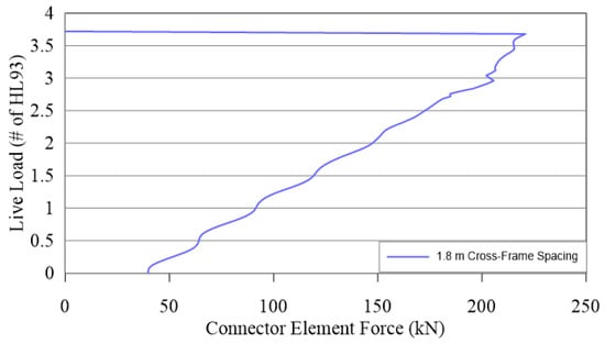 Figure 7 shows the connector element force of the cross-frame close to the fracture in the bridge with 1.8 m cross-frame spacing. The force in the section reaches 39.7 kN under the dead load once a fracture occurs. This means the cross-frames contribute in carrying the dead load after the fracture and the cross-frame force reaches to its maximum connection capacity of 220 kN under the live load equal to 3.6 times HL93 loading. After the connection failure (local plateau in the load-deflection curve) vertical loads redistribute to the remaining cross-frames and the bridge continues carrying load until the global failure (plateau in the bridge load-deflection curve).