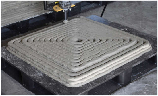 3D-printed construction is an advanced, additive construction process capable of producing a variety of complex structures and components without formwork using a layer-by-layer material deposition approach. The process combines elements of materials science with architectural, structural, mechanical, civil, and software engineering to print full-scale structures and components [1]. Three of the most common methods of 3D-printed construction are contour crafting, a wet extrusion method that uses two trowels to shape the top and side of the material layers as they are being extruded; concrete printing, a wet extrusion method used to print both the perimeter and infill of structures without incorporating trowels for surface finishing; and powder bed fusion, a dry method that uses a binder, laser, or electron beam to fuse powdered material together [2,3,4]. These methods are typically used to either print the structure itself or to print molds and formwork subsequently filled with conventional concrete [1].