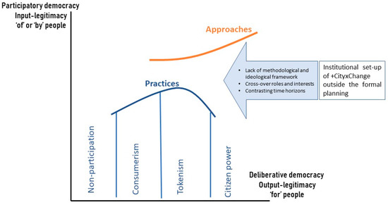 To conclude, the institutional structure of +CityxChange outside the formal administrative planning framework and the corresponding three functional barriers have resulted in a mismatch between the prevailing participatory approaches and practices that Figure 4 shows.