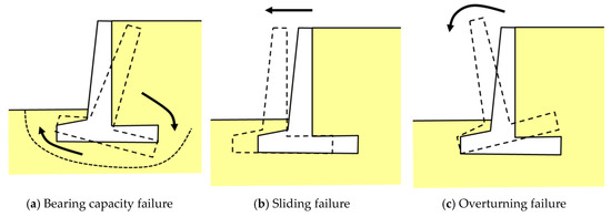 Reinforced concrete retaining walls (RCRW) set up an essential part of infrastructures which are commonly erected for various applications, generally for road and transportation structures, bridge abutments, lifelines, etc. RCRW must safely and consistently support the backfill ground and have enough stability against sliding and overturning failures. Furthermore, crucial stresses in both the structure and the soil should be limited to avoid all failure modes, using appropriate values of safety factors, e.g., the foundation should have enough bearing capacity while tensile stresses are not allowed, since an ineffective area in the foundation–soil interface is developed. Moreover, various structural requirements for both foundation and wall should be fulfilled, e.g., these structural elements should have enough shear and moment capacity or the configuration of steel rebars should comply with structural code provisions.