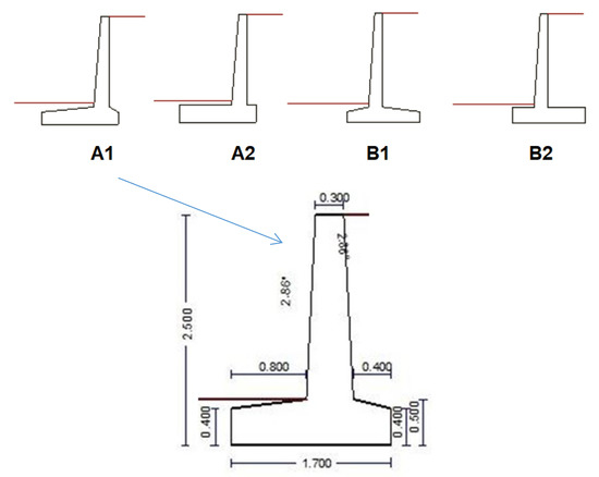 Four basic typologies, named A1, A2, B1, and B2, of reinforced concrete retaining walls are examined here, as shown in Figure 3. It should be mentioned that the total height of soil on the left is equal to H, i.e., the height of the active pressure wedge (see also Figure 2).