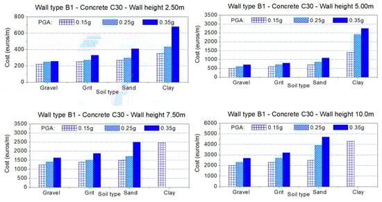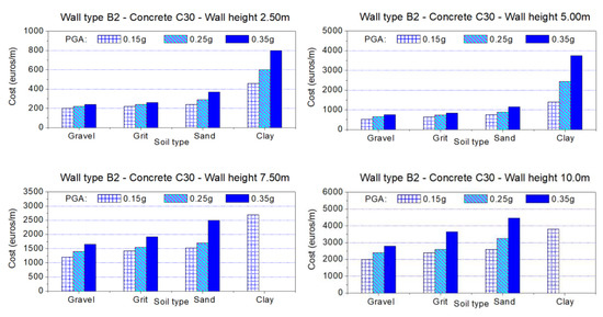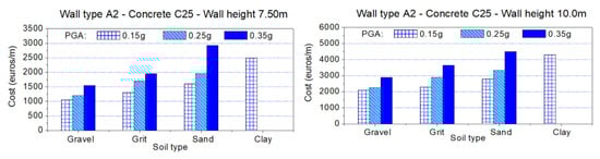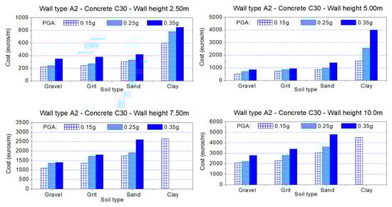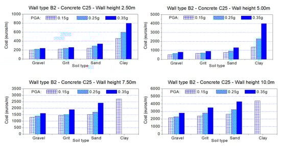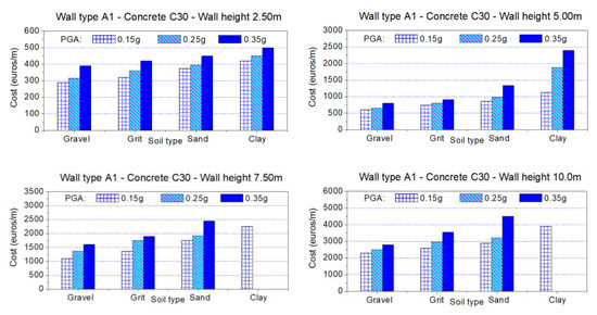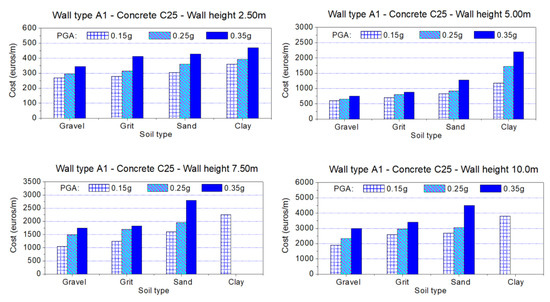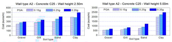 The analysis results are shown in Figure 4, Figure 5, Figure 6, Figure 7, Figure 8, Figure 9, Figure 10 and Figure 11. These figures depict diagrams where each one shows the type of wall under consideration (A1, A2, B1, and B2), the concrete grade (C25 and C30), and the height of each wall (2.5 m, 5.0 m, 7.5 m, and 10 m). Thus, by selecting the above parameters and variables, it seems to be straightforward to draw significant conclusions, e.g., the effect of earthquake intensity on the total cost of the retaining wall and its dependence on wall geometry, soil type, etc. Each retaining wall was implemented, analyzed, and designed 30–40 times, using trial-and-error procedures to minimize the total cost and simultaneously to comply with the Eurocode provisions [14,15,16]. It should be mentioned that, in comparison to structures made by a single material (e.g., steel), member sections consisting of reinforced concrete have bigger dimensions. Furthermore, especially for the case of retaining walls, the minimization of dimensions should take into account both strength and stability criteria (e.g., sliding of the structure) while the “above-ground” constructions, such as building framed structures, were mainly designed using strength criteria only. Finally, the heuristic optimization applied here examined the optimum dimensions of the structural members using a “5 cm” rounding for the case of member length or thickness (5 cm, 10 cm, 15 cm, 20 cm, etc.). Despite the small incompatibility for the rigorous mathematical process of heuristic optimization, this consideration is used in everyday engineering practice and simplifies the whole procedure.