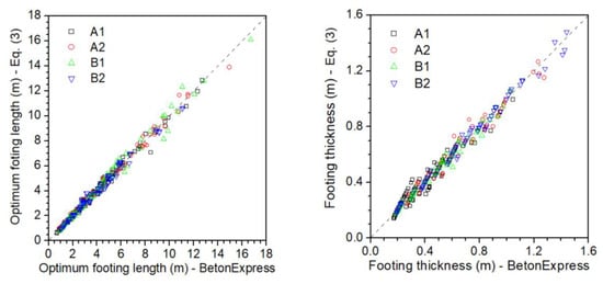 This can also be seen examining the whole set of 384 retaining walls. For example, Figure 12 depicts the optimal values of footing length and thickness (section height) for both procedures (Equation (1)) and BetonExpress design [27], where the agreement between them is obvious. Finally, the validity of Equation (1) can be demonstrated by the square of Pearson correlation coefficient, R2, between the optimal values from this empirical expression and BetonExpress [27], which is equal to 0.954 for footing length, 0.972 for footing thickness, 0.970 for wall thickness at its base, 0.969 for wall thickness at its top, and 0.952 for total cost.