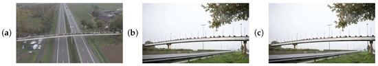 Impressions of the Eeklo footbridge during the large-scale measurement campaign: (a) top, (b) side and (c) below view.