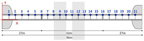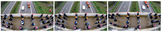 Twenty-one static cameras (GoPro, Hero Session, 1080p, 30 fps) were used to register the entire bridge deck. The devices were mounted on aluminum trusses which were firmly fixed to the parapet the bridge deck. The position of the static cameras and the global axes considered in the present study are shown in Figure 2. The cameras were synchronized offline, using a common occurrence in the different cameras, i.e., a car driving with a speed of approximately 120 km/h crossing a reference point. As the car speed is high compared to the walking speed of the pedestrians (≈5 km/h) and the given frame rate, the synchronization of the frames is more than sufficient. Figure 3 shows an example of 3 synchronized images. The duration and number of video frames as recored by the static camera setup for each test is listed in Table 1.
