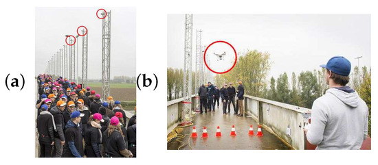 Recording the pedestrians during the measurement campaign: (a) static camera setup and (b) pilot controlling drone during takeoff. The cameras are indicated with a red circle.