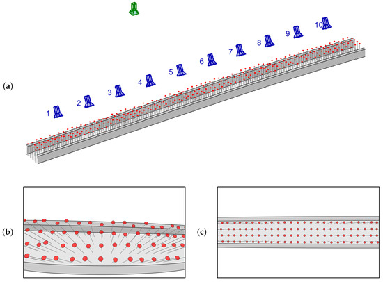 Results of the preliminary study of the location and orientation of the static (blue) and drone (green) camera setup: (a) half a bridge deck with simulated grid of pedestrians with a red hat and a uniformly distributed random height between 1.6 m and 2.0 m. FOV of (b) static camera 3 and (c) the drone camera.