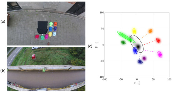 To select four optimal hat colors available from the supplier, a preliminary study was performed. Pictures were made of the candidate hat colors (light green, dark green, light blue, dark blue, yellow, purple, magenta, orange and red) and the background. Their corresponding (,) coordinates are plotted in Figure 7. Based on the latter representation, it was opted to use the red, orange, dark blue and magenta colors in the measurement campaign. The distance in the (,)-plane is maximal to the background while their interdistance is sufficient to be distinguishable.