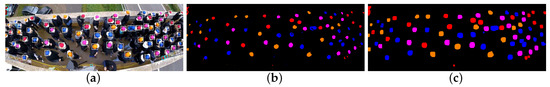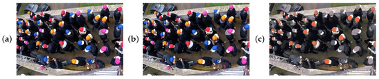 The present work uses 10 clusters to segment the colors. The clusters matching the colors of the hat are selected, thereby defining the corresponding regions in the space. As the mapping of the RGB to the CIELAB color space is one-to-one, each component of can thus, via the corresponding component in the vector , be related to a binary value. Because four hat colors are used, the final result is four binary maps , , and , which are practically combined to a single binary map . Figure 9 shows the results of the applied procedure.