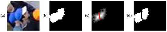 One important drawback of the color-segmentation algorithm is that two adjacent blob regions of the same color can be incorrectly joined (Figure 11a,b). This occurs most often at the outer sides of the FOV of the cameras because of the increased obliqueness and for two pedestrians with a small interdistance (<75 cm) and a large difference in height. To overcome this issue, a watershed analysis (function watershed) is performed. This transform is often used in the field of image processing for segmentation purposes and defined on a grayscale image [49]. When the gray value is thought of as a topographic quantity, the watershed returns the lines which correspond with the ridges of this quantity. In the present case, the binary distance (function bwdist) of a pixel is considered to be the relevant property, defined as the maximum horizontal or vertical distance of a certain pixel to the nearest pixel which has the value zero [50]. As the detection of a hat is typically nearly discoid, two adjacent circles possess a local ridge in the binary distance. As such, a watershed transform allows segmentation of these bounded regions into two disjoint ones. An illustration of the use of the watershed process to segment two adjacent blobs initially detected as one is shown in Figure 11.