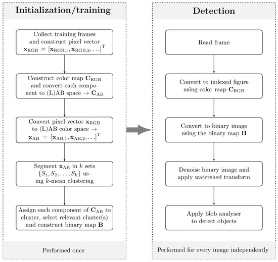 Next, both the pixel vector and corresponding color map are converted to the (L)AB space yielding the quantities and . To determine which elements of belong to the background or a detected color, the vector is segmented into k clusters using k-means clustering [48]. This algorithm assigns every element of into one of the k sets such that the within-cluster sum of squares is minimized: