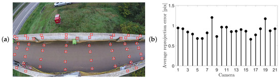 In contrast to the static cameras, where no relative movement occurs because of the firm fixation to the aluminum trusses, the drone is subjected to non-negligible changes in position and orientation due to wind loading. This poses a problem since the calibration is only performed on the initial frame. It is observed that the intrinsic camera parameters, , and radial distortion coefficients, , do not change, and therefore it is only needed to compute the position and orientation of the drone of each frame. The calibration points (×-shaped marks on the bridge deck) are tracked among the different frames using the Kanade–Lucas–Tomasi (KLT) tracking algorithm [53,54] (function PointTracker). The latter is particularly suited for tracking objects that do not change shape and possess a visual texture. The tracker is configured using 3 image pyramid levels, a rectangular neighborhood block size of 51 pixels and a maximum forward-backward error threshold of 10 pixels. A reliability score for each tracker point is computed accounting for the singularity of the spatial gradient and verifies if the maximum reprojection error does not exceed the user-defined value. Tracked points with a reliability less than 0.95 are excluded from further analysis. The retained tracked points are used to estimate the pose using the 3D-2D correspondences using the same procedure as in Section 4.1.2 but with the internal parameters , , , and radial distortion coefficients ,, already known.