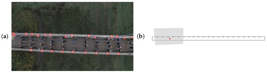 Calibration of the drone camera: (a) initial frame with indication of image correspondence points (△) and the reprojected world correspondence points (□) and (b) indication of the drone’s initial position relative to the bridge deck (red dot) and initial FOV (gray-shaded area).