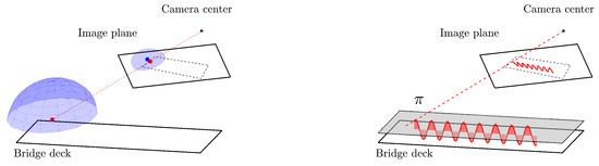 In general, one needs stereo vision to retrieve the 3D location of an object. If, however, additional information is available it might be possible to retrieve the world coordinates based on a single 2D image. In our case, the height of every pedestrian is known. One can therefore define a plane , parallel to the bridge deck with a distance equal to the participant’s height. The detection should lie on this plane and thus a planar homography can be used to relate a measured image coordinate to a corresponding world location (Figure 17b). Hartley and Zisserman developed a methodology to obtain a homography between the image plane and plane if 4 correspondence points on the plane are known [52]. While easy to use since the projection matrix of the camera is not required, an important drawback is that for every pedestrian (which has his own height) 4 calibration points are needed. Theoretically this would require 148 × 4 points per camera. To overcome this cumbersome procedure, the homography is instead directly calculated using the projection matrix of the camera and the pedestrian’s height, as described in Appendix A. The latter procedure is possible since the projection matrix of each camera is known in the present study.